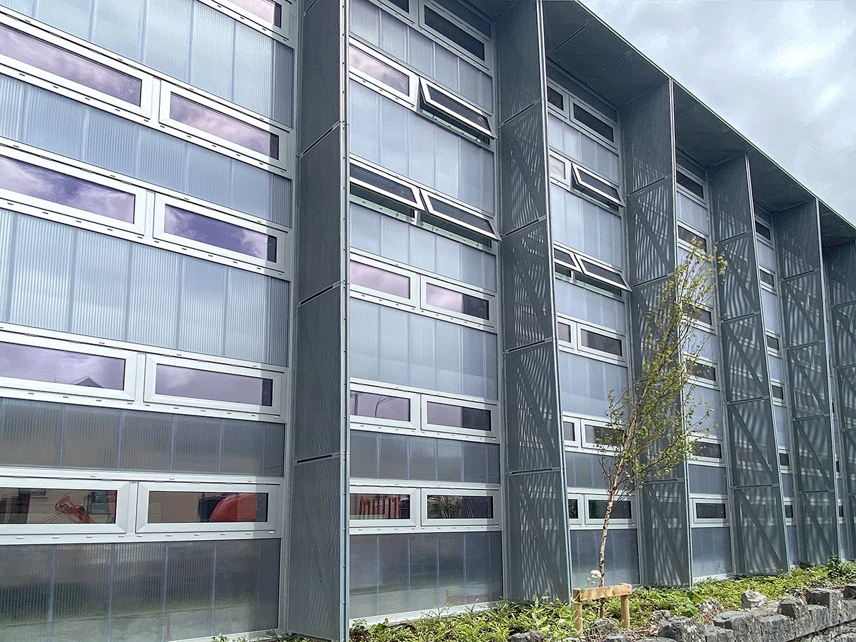 2022 saw completion of Ennis Community College Campus. Rodeca 50mm panels were used in conjunction with our series 85 double glazed window system to provide a completely translucent facade.