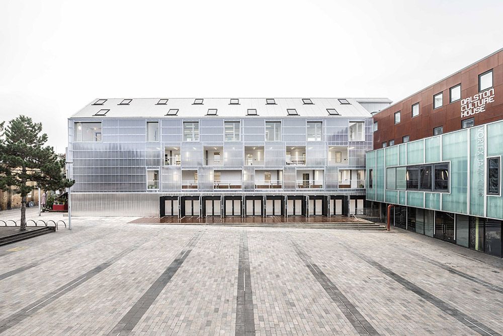 Rodeca’s 40mm PC 2540-4 wall panel provided the external fabric to the redisgn and refurbishment of Bradbury Works, Dalston. The crystal translucent panel provides both rainscreen and glazed areas allowing daylight into the semi external spaces to Gillett Square. Although translucent, the building has a uniform appearance even though what sits behind varies in application. The wall build-up to the rainscreen areas are visible, whilst the glazed areas blend to reflect the weather and time of day creating abright, light, almost floating structure.