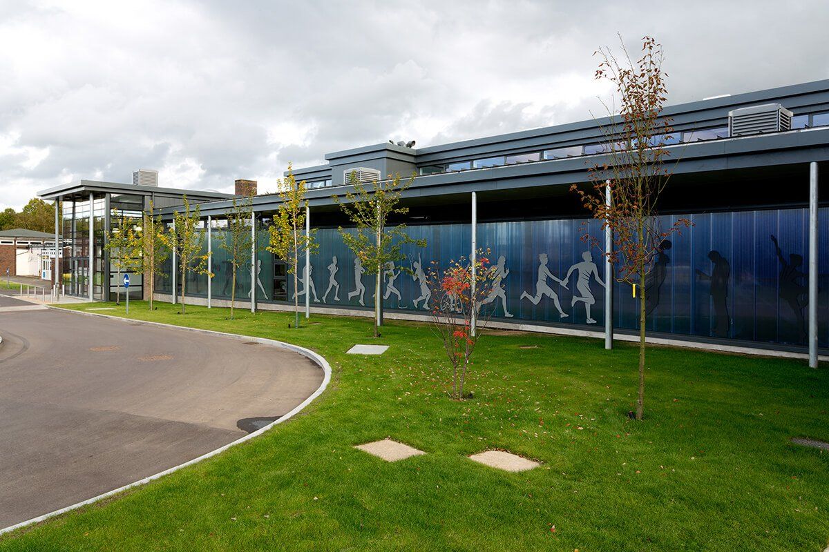 Rodeca PC 2540-4 bicolour panels in six different colours and shades provided the glazed ground floor frontage to a new dance, fitness and admin building. The application consists of a double wall construction with support structure sitting within the cavity. The design increased thermal performance whilst providing a smooth, full height finish to the interior. Vinyl graphics depicting dance and sports characters were applied to the external face of the panels. During the daytime the hues and graphics are quite subdued. At dusk, the facade comes to life with silhouettes contrasting against the coloured panels illuminated by the ambient lighting of the studios.